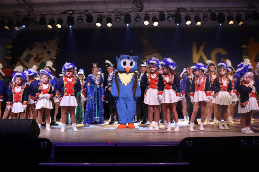 Gleich zu Beginn hieß es Bühne frei für den Jugendelferrat und die Garden der KG: Die Purzelgarde, die kleine, mittlere und große Prinzengarde begeisterten das Publikum mit ihrem traditionellen Aufmarsch. Mit dabei war natürlich auch das Prinzenpaar Prinz Joachim I. und Prinzessin Caroline I. (Joachim Reimertshofer und Caroline Beck), begleitet von Hofdame Sabine, Hofmarschall Achim (Sabine und Achim Glockengießer) und Zeremonienmeister Hans Schneider. Nach der Ansprache des Prinzenpaares, die das Publikum mit einem dreifach kräftigen „Mörlau!“ begrüßten, gab es eine ganz besondere Premiere: Das neue Maskottchen „Eule Mörlau Huhu“, dargestellt von Rike Wielpütz, flatterte mit ihrem mitreißenden Eulen-Song „Ganz blau“ auf die Bühne und bezauberte Groß und Klein.